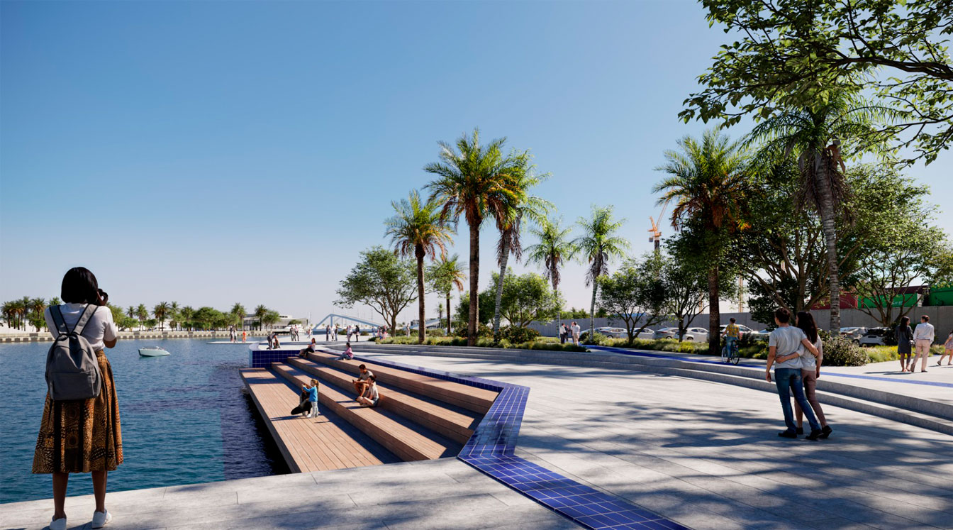 El paisaje actúa como nexo entre arquitectura, agua y ciudad en el entorno portuario.